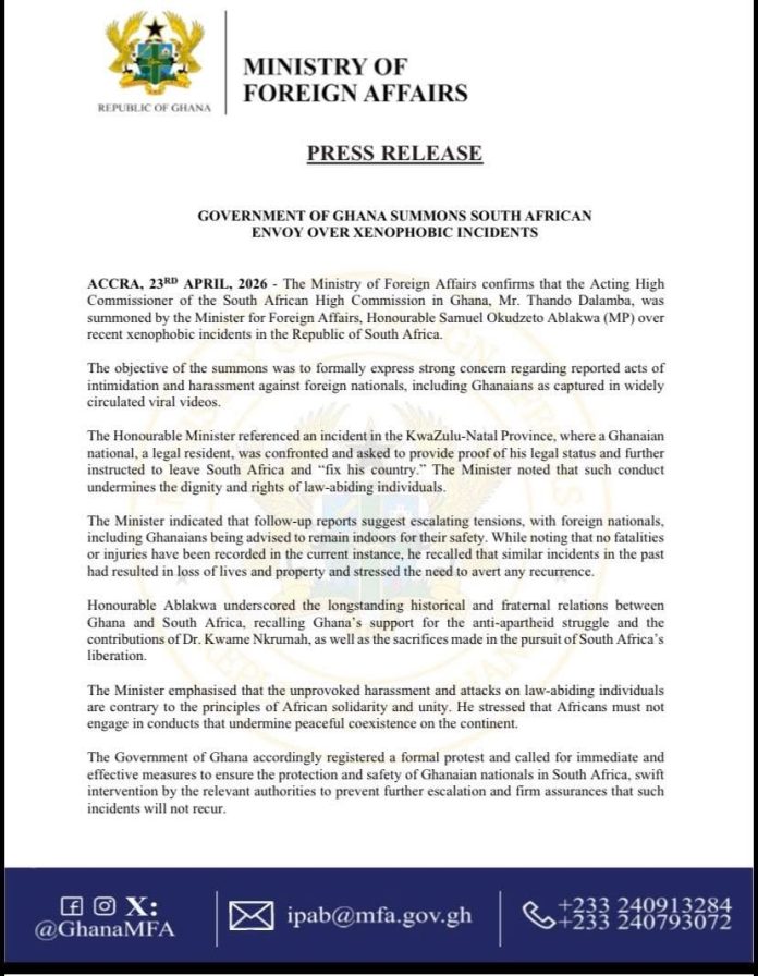 In a press release issued by the Ministry of Foreign Affairs on 23 April 2026, the Acting High Commissioner of South Africa to Ghana, Thando Dalamba, was called to a meeting with the Minister for Foreign Affairs, Samuel Okudzeto Ablakwa. The summons was to formally convey Ghana’s concern over recent incidents circulating widely on social media, which depict harassment and intimidation of foreign nationals.
